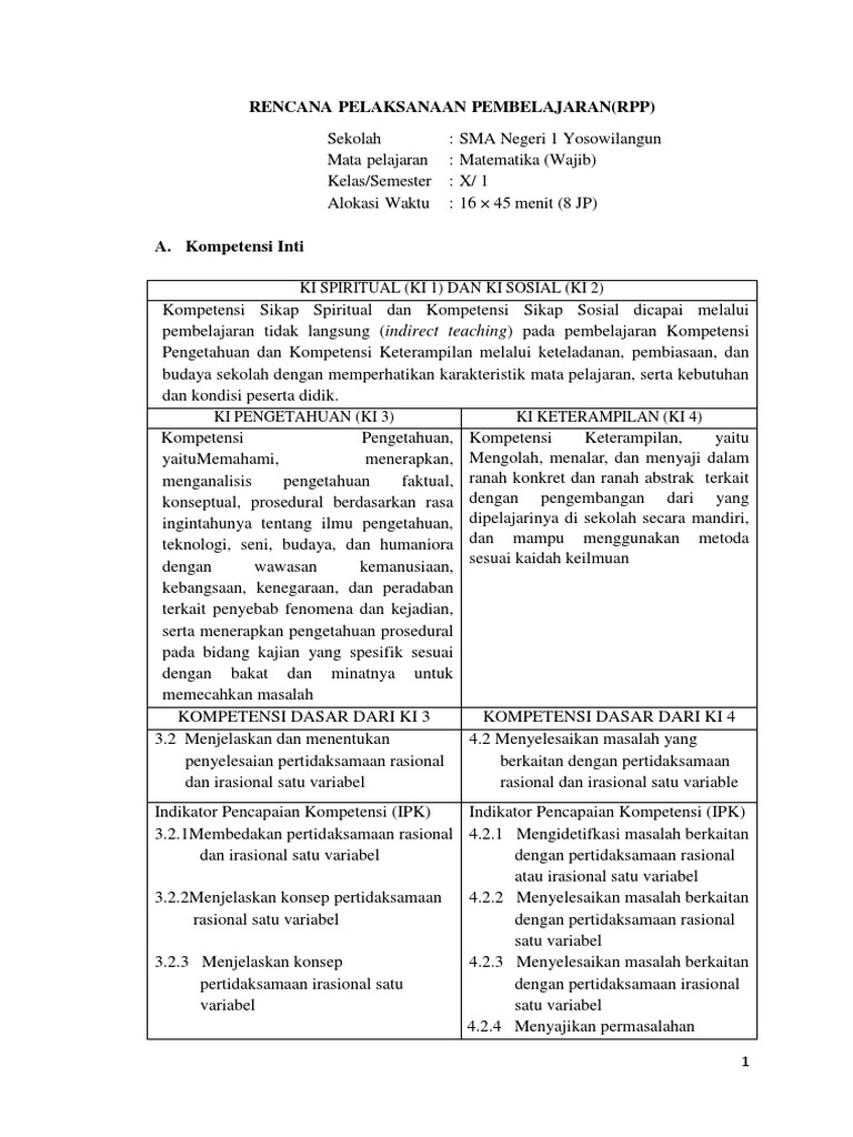 Rpp Pertidaksamaan Rasional Dan Irasional Kurikulum 2013