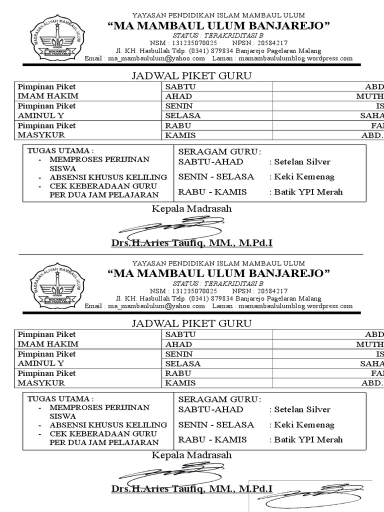 Contoh jadwal seragam guru. Jadwal supervisi akademik oleh kepala sekolahmadrasah diamasukkan sebagai lampiran 1 dalam laporan pelaksanaan supervisi. Mudah mudahan isi postingan yang kami tulis ini dapat anda pahami. Agar pelaksanaan supervisi akademis tahun pelajaran 20102011 ini berlansung efektif dan dapat memvisitasi seluruh guru mata pelajaran maka petugas supervisi terdiri atas.