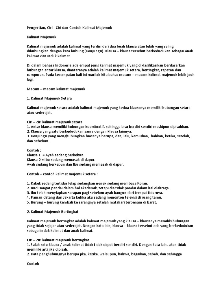 Doc Pengertian Kalimat Majemuk Wulan Indah Academia Edu from 0.academia-photos.com Kalimat majemuk setara disebut juga kalimat majemuk koordinatif. Kalimat majemuk ini terdiri dari empat macam, yakni kalimat majemuk setara, kalimat majemuk bertingkat, kalimat majemuk ratapan, dan kalimat majemuk campuran. Kalimat majemuk campuran adalah kalimat majemuk yang merupakan gabungan dari kalimat majemuk setara dan bertingkat. Tedapat klausa setara dan bertingkat. Ciri ciri kalimat majemuk setara: Pengertian, ciri, syarat, unsur, struktur, dan contoh. Memiliki lebih dari satu subjek dan satu predikat. Kalimat majemuk setara secara umum memiliki beberapa ciri diantaranya yakni :